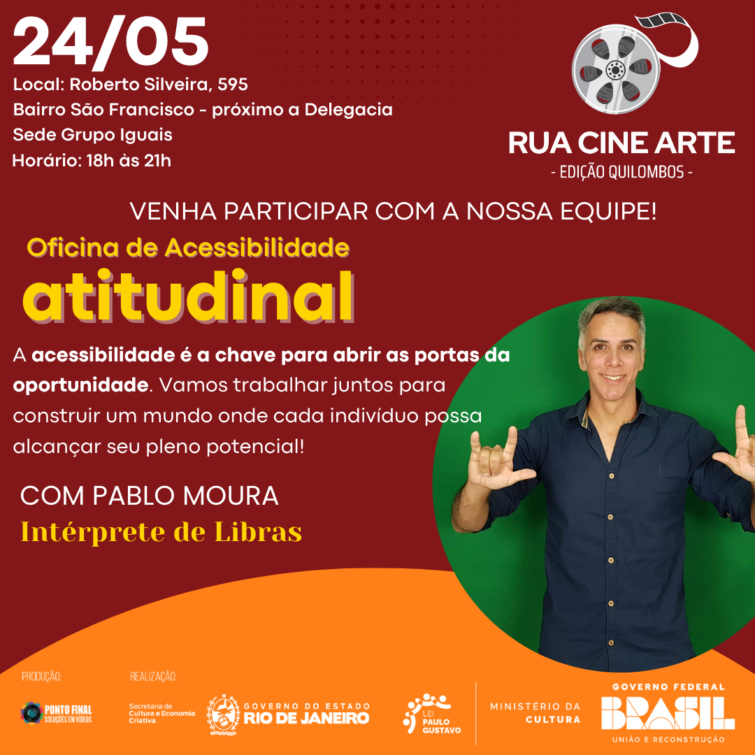 A oficina que será ministrada pelo instrutor de Libras, Pablo Moura, busca ser uma plataforma que celebra a riqueza de identidades, promovendo a igualdade e o respeito mútuo. As vagas são limitadas e as inscrições podem ser feitas pelo formulário disponível no link do perfil do projeto no Instagram (@ruacinearte). As atividades serão realizadas a partir das 18h, na sede do Grupo Iguais, localizado à rua Roberto Silveira, 595, bairro São Francisco, próximo à Delegacia de Cabo Frio.