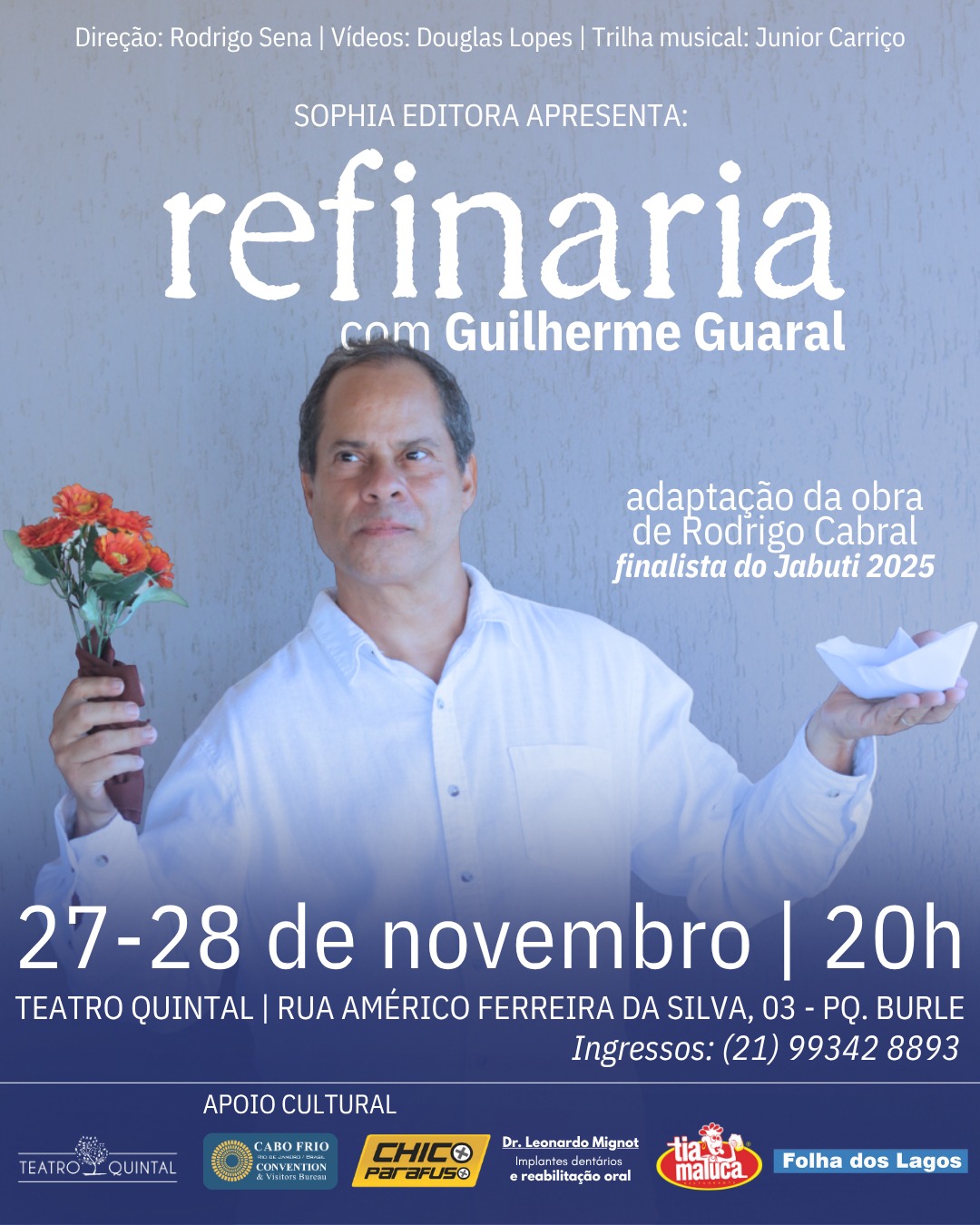 No mês em que Cabo Frio celebra 410 anos, um espetáculo sobre memória, território e pertencimento ganha a cena e se inscreve, também, como parte das comemorações simbólicas. “Refinaria”, adaptação teatral do livro homônimo de Rodrigo Cabral, finalista do Prêmio Jabuti 2025, estreia no Teatro Quintal (Rua Américo Ferreira da Silva, n.º 3, Parque Burle), com apresentações nesta quinta (27) e na sexta (28), às 20h. A montagem reúne o ator Guilherme Guaral, o diretor Rodrigo Sena, o compositor Junior Carriço e projeções inéditas de Douglas Lopes. Os ingressos custam R$ 25, com reservas pelo telefone (21) 99342-8893. A estreia tem apoio cultural de Tia Maluca, Cabo Frio Convention Bureau, Dr. Leonardo Mignot e Folha dos Lagos.