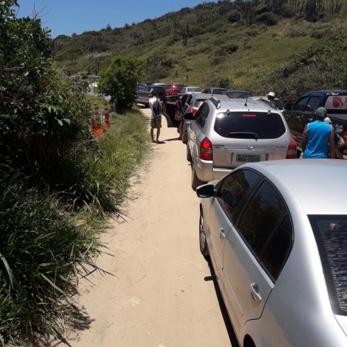 Calorão e céu aberto eram convite e tanto para visitar um dos principais cartões-postais de Cabo Frio neste sábado (3) de feriado: a Praia das Conchas. Mas aqueles que escolheram o destino tomaram um "banho de água fria" ao ter de amargar congestionamento que chegava a ultrapassar meia hora nos acessos à praia. Isso porque o estacionamento privativo das Conchas teve atividades interrompidas por ordem da prefeitura, que alegou ausência de licença para a cobrança (a taxa é de R$ 20 para turistas). Os administradores do espaço acataram a decisão, não permitindo, porém, que os veículos parem gratuitamente em área particular. Estacionamento em fila dupla e carros parados sobre vegetação em área de conservação ambiental somam-se ao cenário de desordem.