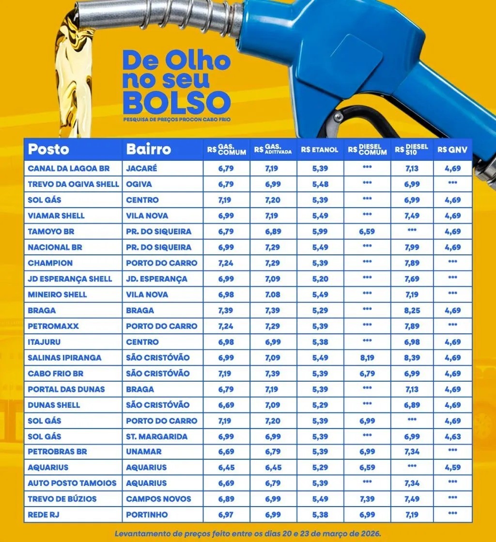 Confira a seguir a tabela dos preços verificados pelo Procon nos postos de Cabo Frio. O levantamento foi feito entre os últimos dias 20 e 23 de março.
